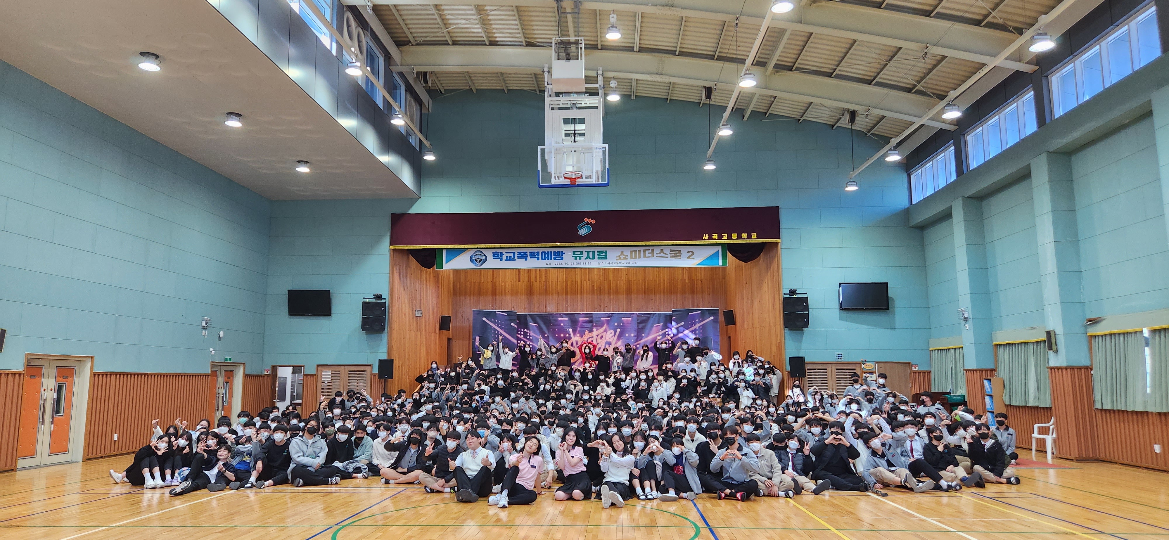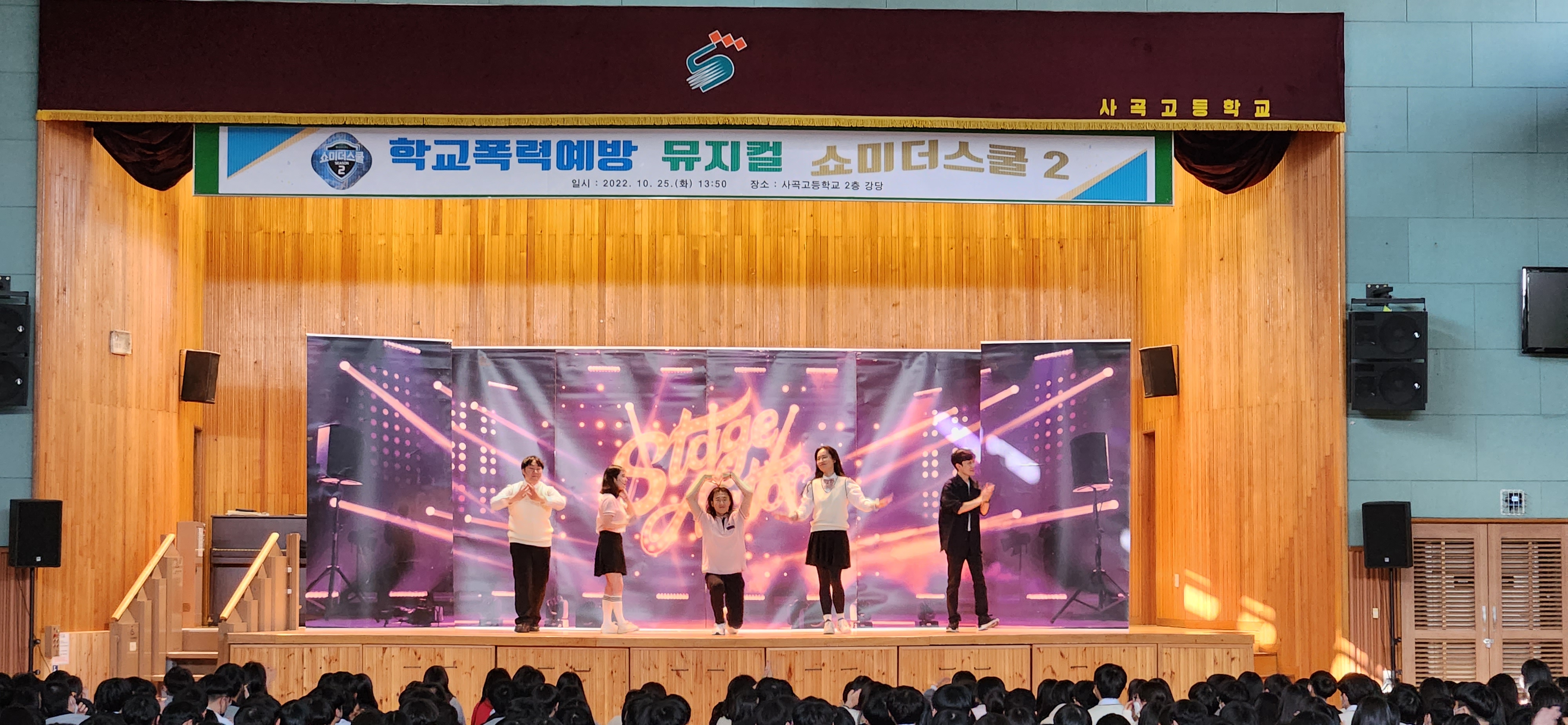 사곡고등학교(학교장 노순광)는 10월 25일 교내 강당에서 1, 2학년을 대상으로 학교폭력 예방 창작 뮤지컬 ‘쇼미더스쿨 시즌2’를 상연했다. 이번 뮤지컬 관람은 공감, 의사소통, 자기존중감, 갈등해결, 학교폭력 인식 및 대처 등의 역량을 강화하고 학교폭력 예방 메시지를 자연스럽게 전달하기 위해 실시되었다.