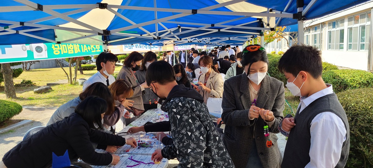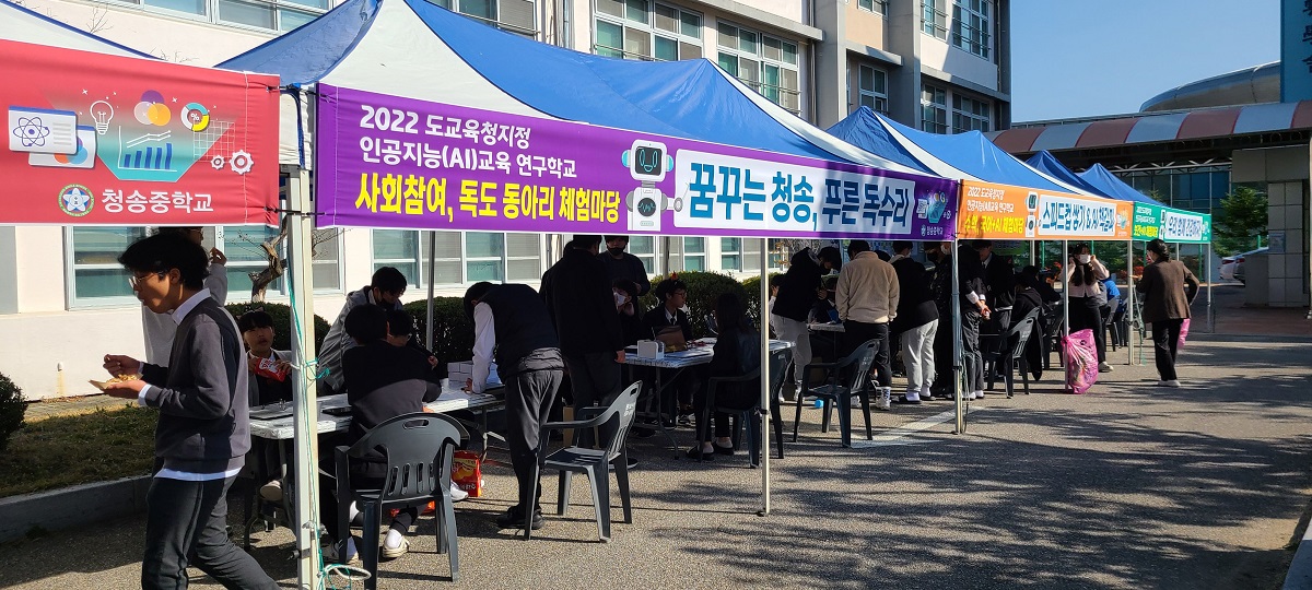 □ 올해 청송중학교는 ‘인공지능 융합 교육과정 운영을 통한 미래 인재 양성’이라는 주제로 경상북도교육청 지정 AI 교육 연구학교를 운영하고 있으며, 행사 마지막 날인 27일에는 연구학교 보고회를 겸하여 AI 융합 교과 연계 프로그램을 선보였는데, AI 책갈피 만들기, 잉글리시 카페, 드론 축구를 경험할 수 있는 사이언스 플레이존, 코딩 한마당과 메이커 체험, 사회 참여 동아리인 ‘꿈꾸는 청송’ 우리 역사 바로 알기 ‘독도 동아리 카페’ 특수 교육과 금연과 건강 교육을 위한 보건 체험 부스 등 10개 교과가 참여하는 AI 융합 체험 페스티벌을 함께 실시했다. 행사에는 관내 학교장과 교육지원청 관계자, 학부모 등 많은 방문객이 참여하여 청송중학교의 다양한 AI 융합 교육 활동을 함께 체험하였다.