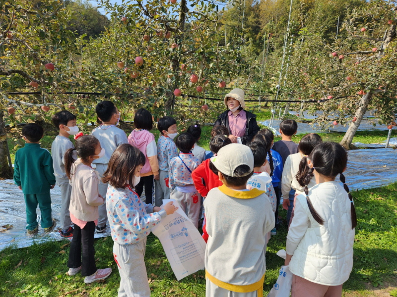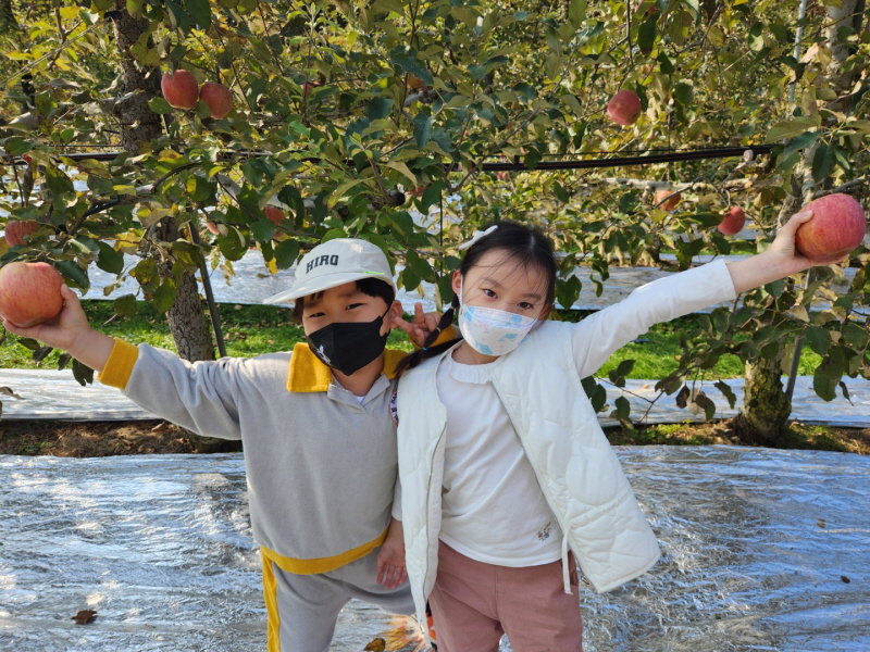 □ 지역과 연계하여 농부 선생님의 ‘사과가 나무에 열리기까지의 과정’ 및 ‘올바른 사과 따기 방법’영상을 사전에 각 교실에서 시청하고 연령별 다른 요일에 체험을 진행하여 안전하고 즐거운 시간을 가졌다.
