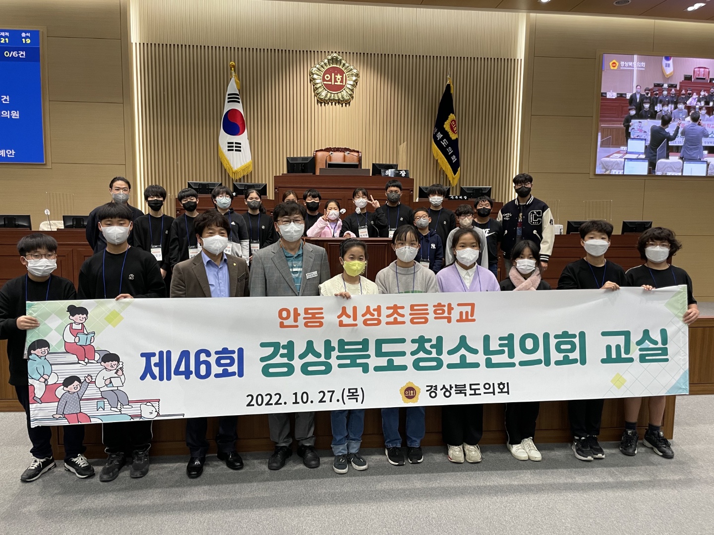 ☐ 신성초등학교(교장 정도기)는 5, 6학년 학생을 대상으로 10월 27일(목), 경북교육청과 경북도의회에서 운영하는 "2022 청소년 의회교실" 체험을 실시하였다. 이 행사는 경상북도의회에서 관련 조례에 따라 학생들이 직접 의사진행 과정을 체험하며 지방의회의 기능에 대해 올바른 이해를 도모하기 위해 운영하는 프로그램이다. 프로그램에 참여한 학생들은 독도 홍보 영상을 시청하고 직접 일일 도의원이 되어 학생들의 권익 보호나 지역 현안에 대해 토론하는 기회를 가졌다.