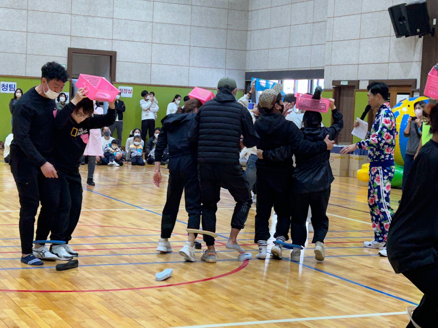 □ 먼저, 원장선생님의 개회선언을 시작으로 유아들은 가족과 함께 손을 잡고 씩씩한 모습으로 입장을 하였으며 신나는 몸 풀기 체조를 통해 재미있을 뿐만 아니라 모두가 안전하게 즐길 수 있는 체육대회를 기원하였다. 첫 번째 종목은 코끼리 코 줄 뛰어넘기로 홍팀, 청팀 유아와 학부모가 발밑으로 지나가는 코끼리 코 줄을 호흡을 맞춰 뛰어넘었다.