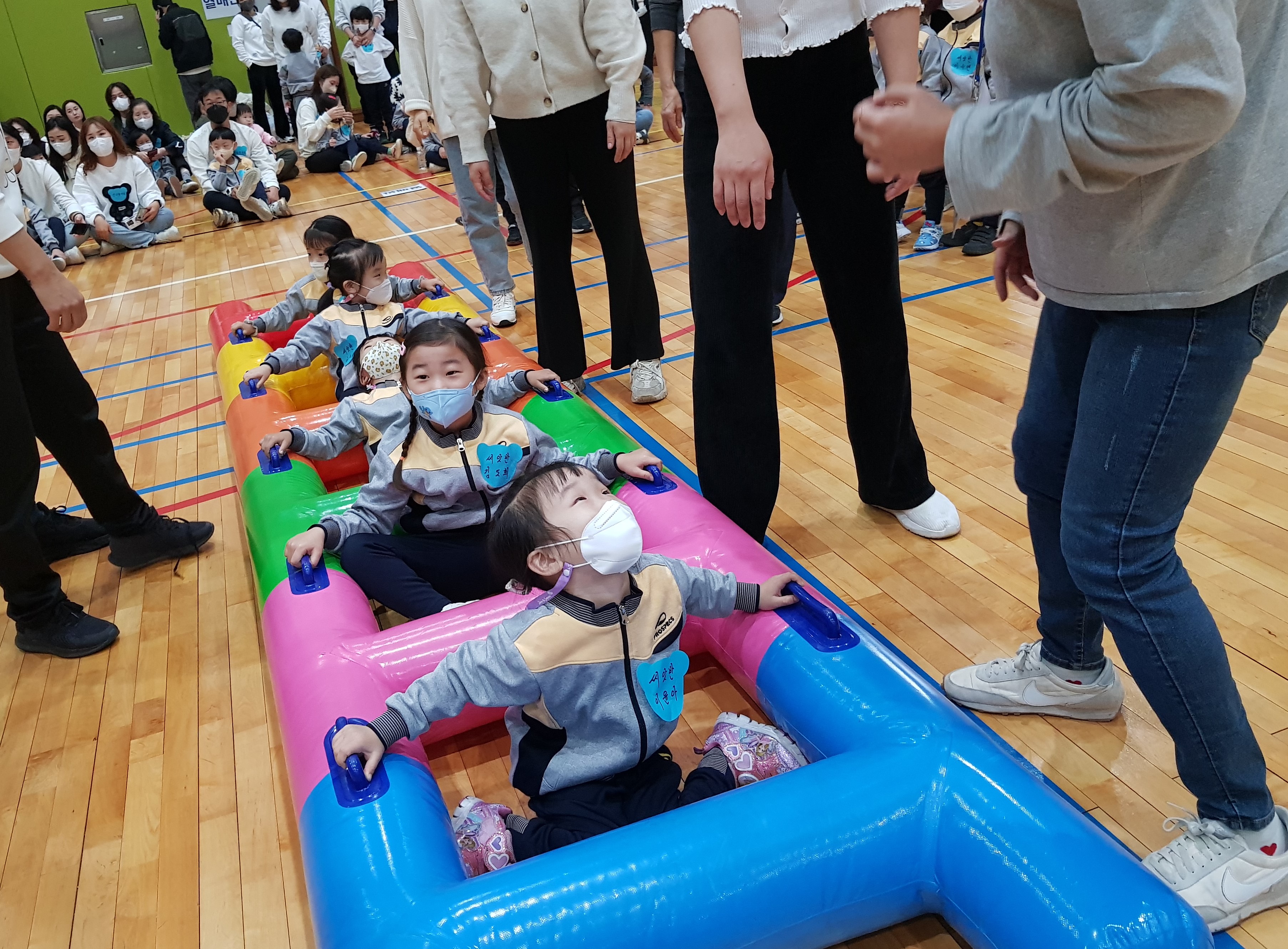 다음으로 유아 및 부모 달리기가 차례로 진행되었으며 유아는 건너편에서 기다리고 있는 부모를 향해 주먹을 불끈 쥐고 최선을 다해 결승점까지 달렸다. 또한, 만 3세의 에어 사다리, 만 4세의 토끼와 거북이 릴레이, 만 5세의 색판 뒤집기가 진행되었으며 유아들의 경기가 끝난 후에는 어머님들끼리 경기인 탱탱볼 전달하기, 아버님들의 줄다리기 등을 통해 학부모들도 유아들과 함께 체육대회에 적극적으로 참여하며 유아와 부모가 서로를 힘껏 응원하는 모습을 볼 수 있었다. 마지막으로 체육대회의 마무리를 장식하는 계주 달리기, 화합의 한마당 및 행운권 추첨 시간을 가지며 가족과 친구, 선생님과의 잊지 못할 추억을 만들었다.