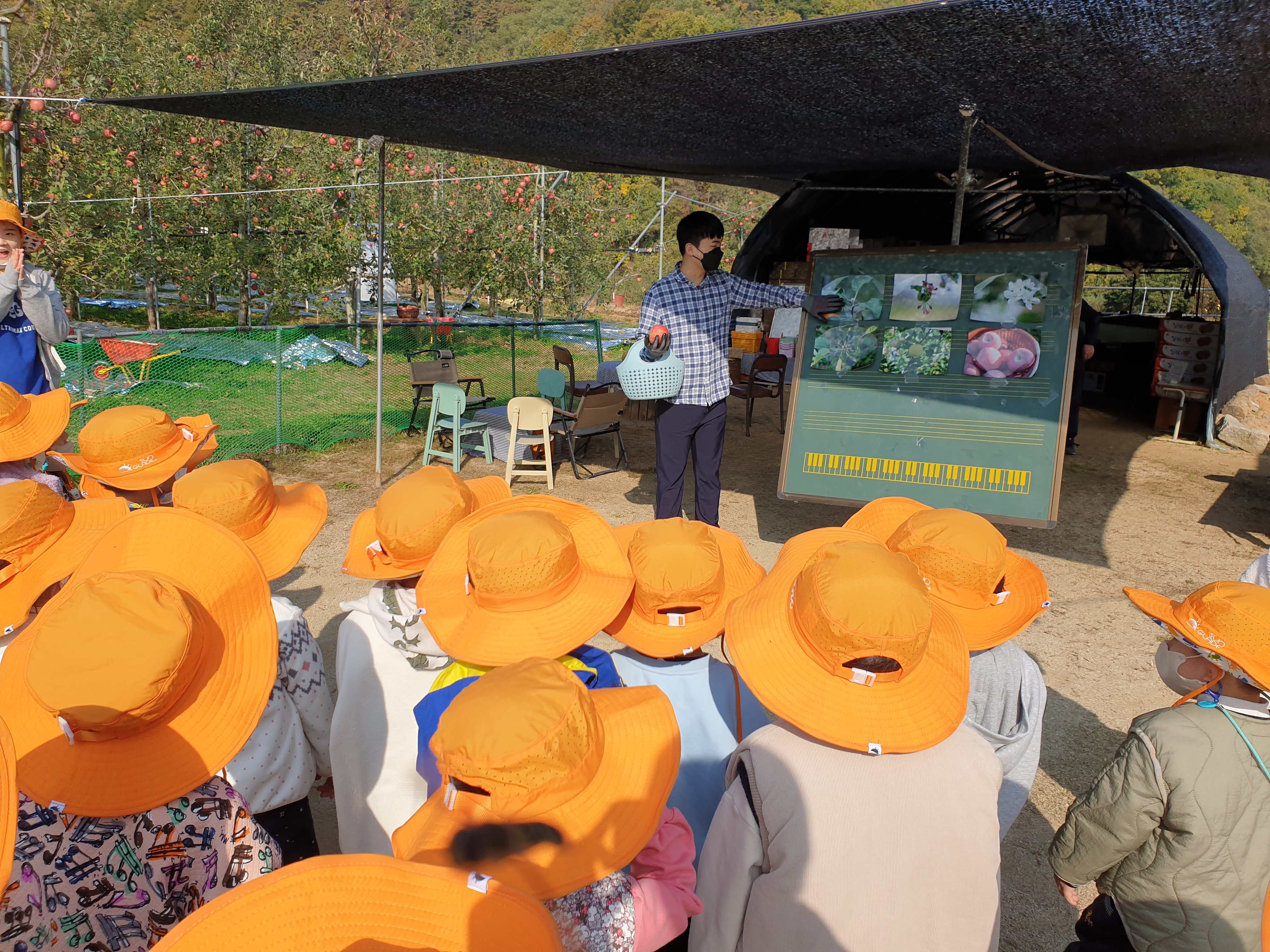 □ 순우농원에 도착한 유아들은 넓게 펼쳐진 과수원을 둘러보며 농부 아저씨의 안내에 따라 사과의 종류, 사과나무의 성장 과정, 수확 방법 등에 대해 알아보았다. 이후 친구들과 함께 사과를 따서 냄새를 맡아보고 직접 맛보며 즐거운 시간을 보냈다.