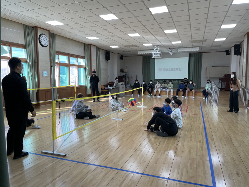 □ 이번 『장애인식개선교육』은 칠곡장애인종합복지관 사회복지사를 강사로 초청하여 장애인에 대한 올바른 호칭 알기, 장애인에 대한 편견 깨기, 장애 관련 퀴즈 풀기 등의 활동을 통해 장애에 대한 바른 지식을 습득할 수 있도록 하였다. 또한 장애인 스포츠(좌식배구) 체험을 통해 장애인도 우리와 동일하게 일상생활을 영위할 수 있다는 것을 깨닫게 되었다.