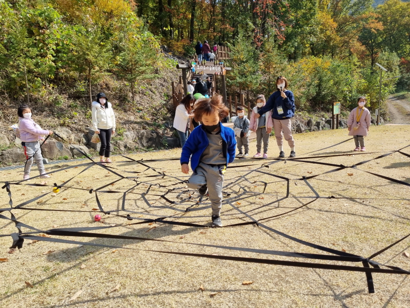 숲 체원에 도착하여 숲에서 벌, 뱀 등을 마주쳤을 때의 안전한 행동과 규칙에 대해 이야기 나누고 이동했다. 유아들이 체험할 프로그램은 ‘숲파이더맨’으로 거미에 대해 놀이를 통해 알아볼 수 있었다. 먼저 거미를 자연물과 찰흙으로 생김새를 표현해보았으며 거미줄을 무사히 통과하기, 거미줄에 도꼬마리 던지기 게임을 통해 거미줄의 특징을 알 수 있었다. 유아들은“거미는 왜 이렇게 눈이 많아요?” “거미는 어떻게 거미줄을 건널 수 있어요?”라며 평소 거미에 대한 궁금증을 질문하며 해결하기도 했다.