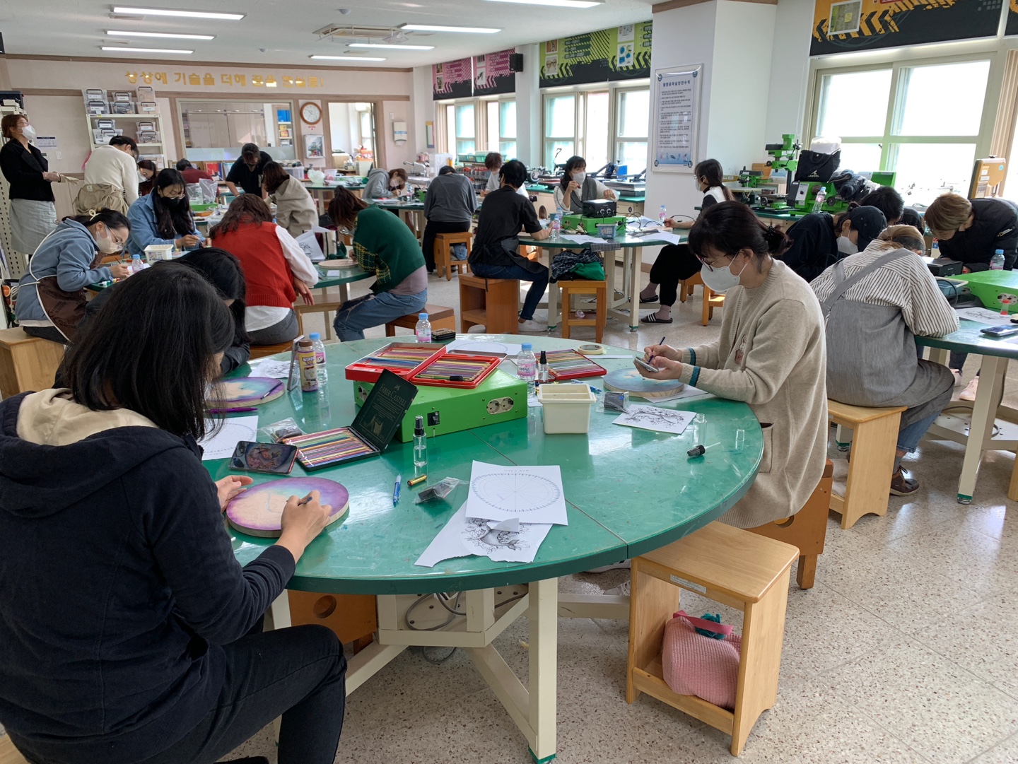 □ 이번 프로그램은 경상북도교육청 메이커교육관 전미래 강사를 초빙해‘Do it yourself, 내 손으로 만드는 생활소품’이라는 주제로 벽걸이 시계 만들기를 하였다. 먼저 안전교육과 가죽공예의 특징, 도구 사용법 등을 익히고 가죽 가공, 조립, 채색 등의 과정을 거치며 나만의 가죽 벽걸이 시계를 완성해갔다.