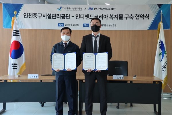[금요저널] 인천중구시설관리공단은 지난 27일 ㈜인디앤드코리아와 임직원 복리후생 향상을 위한 복지몰 ‘복지드림’ 구축 업무협약을 체결했다.