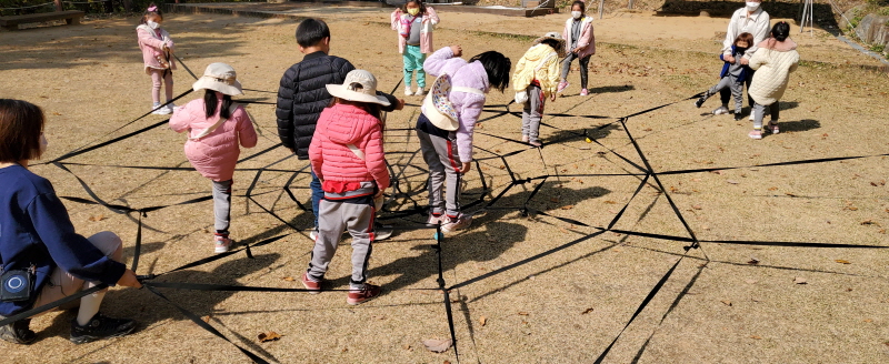 □ 유아숲지도사의 안내에 따라 가볍게 숲길을 걸으면서 다양한 식물에 대한 이야기와 자연물을 활용한‘숲 파이더맨’체험활동으로 거미를 만들어 보는 시간을 가졌다. 하늘뜰에서는 커다란 거미줄 놀이로 거미의 생활방식도 알아 보았다.