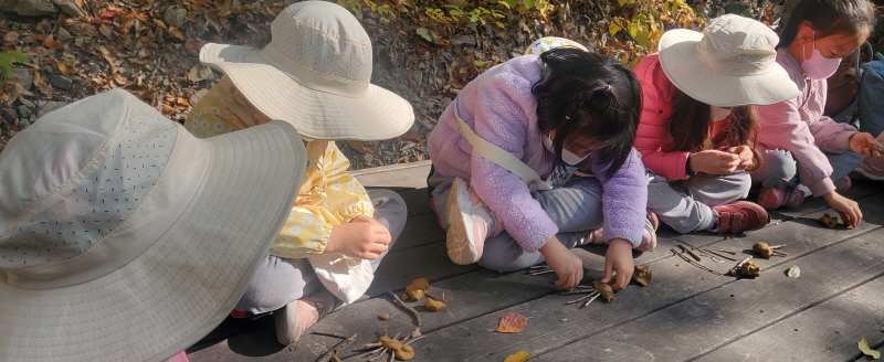유아숲체원을 내려오면서 인○○은“친구들과 함께 참여하며 재미 있었어요”, 이○○은“단풍잎이 너무 이뻐요. 유치원에 가져 갈래요”라며 예쁘게 물든 단풍잎 닮은 손으로 낙엽을 담으며 즐거운 마음으로 유치원으로 돌아 왔다.