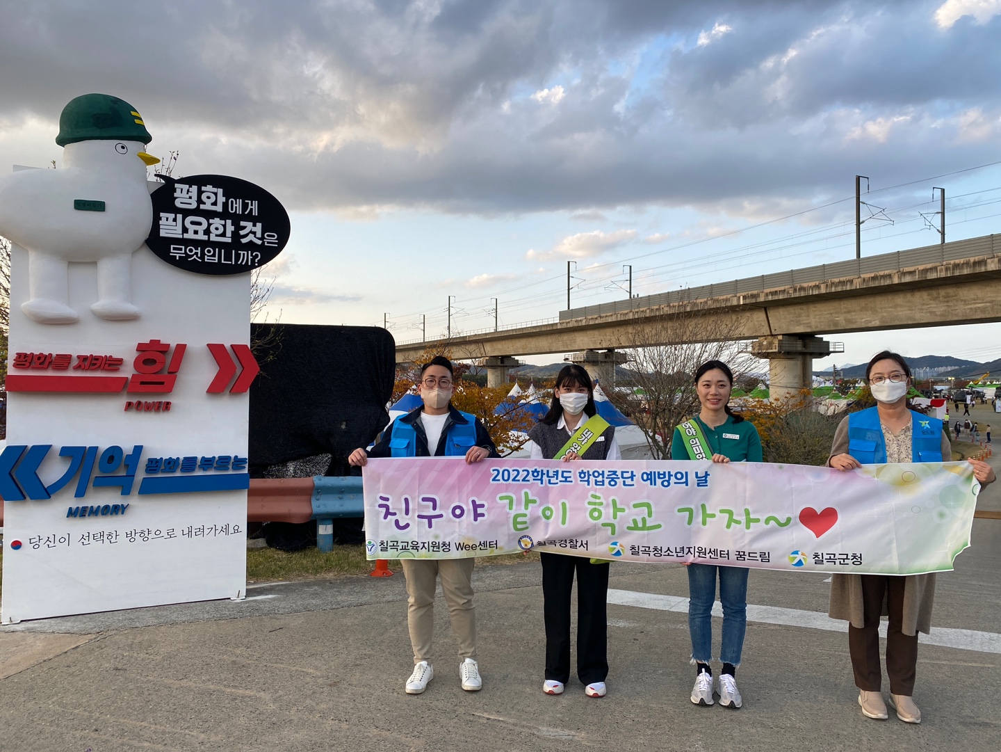 □ 경상북도칠곡교육지원청Wee센터(교육장 최원아)는 칠곡군 호국평화 축제를 맞아 2022년 10월 28일(금) 16시부터 칠곡보 생태공원 및 왜관 1번도로 일대에서 학업중단 예방을 위한 프로그램 홍보와 학교 밖 청소년 지도를 위한 합동 아웃리치를 실시하였다.