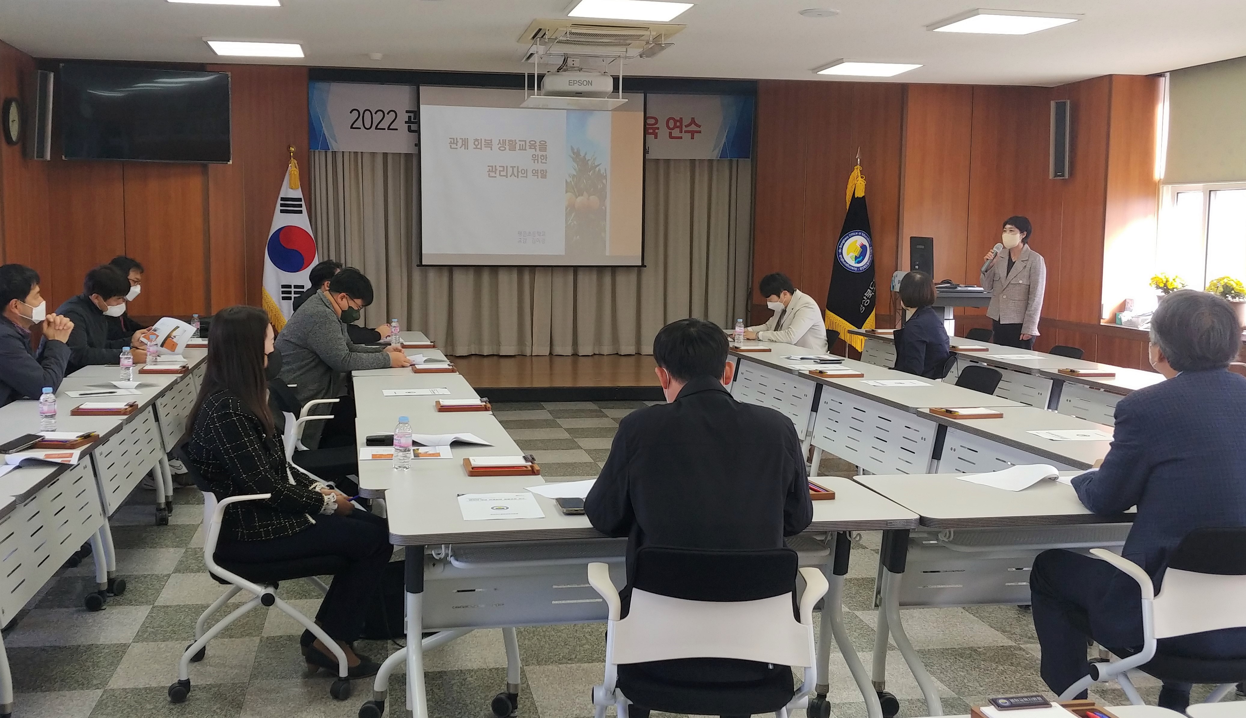 경상북도봉화교육지원청(교육장 박명호)은 2022년 10월 28일(금) 봉화교육지원청 회의실에서 관내 초・중・고등학교 교감을 대상으로 ‘2022 관리자 대상 관계회복 생활교육 연수’를 실시하였다.