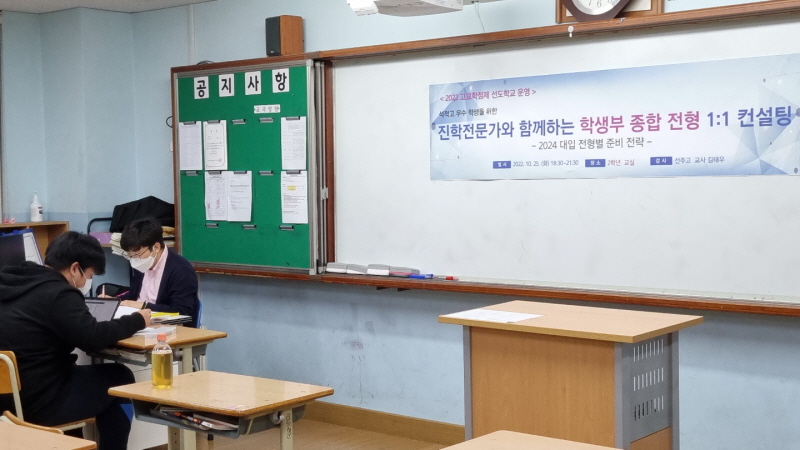 25(화)~26(수)에는 본교 1, 2학년 학생 각 18명을 대상으로 학생부 종합전형 1:1 맞춤형 컨설팅을 실시하였다. 개별 학생의 진로 희망을 중심으로 학교생활기록부를 분석하고 개인별 수시 지원 전략에 대한 컨설팅이 진행되었다. 이를 통해 학생들은 앞으로의 학업 및 활동 계획을 세우고, 희망 진로 및 진학에 대한 구체적인 정보 및 조언을 얻게 되었다.