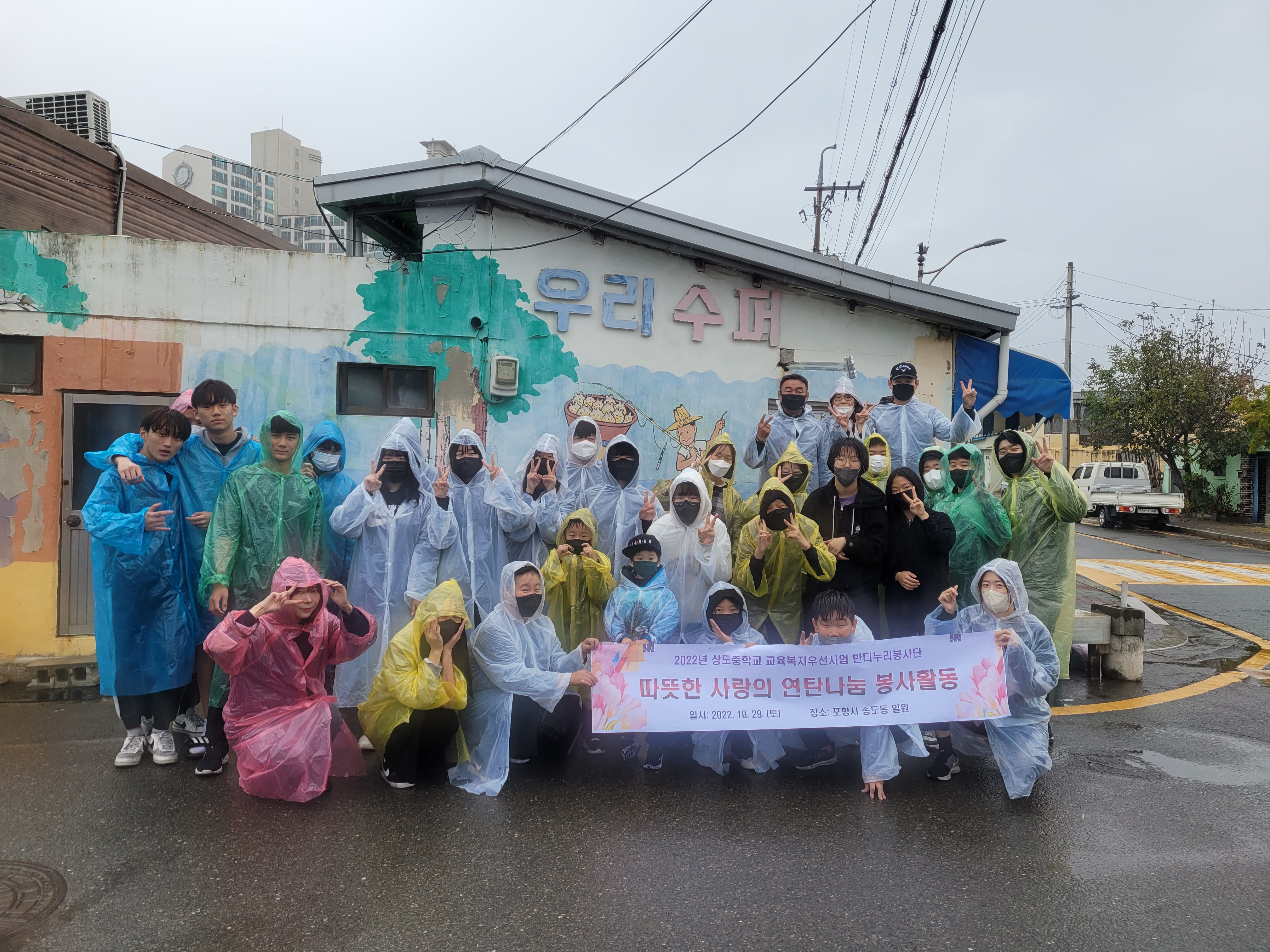 상도중학교(교장 최인호)는 10월 29일(토) 교육복지우선지원사업의 일환으로 학생과 교직원 30명이 참여한 가운데 송도동 일원을 방문하여 [따뜻한 사랑의 연탄 나눔 봉사활동]을 펼쳤다.