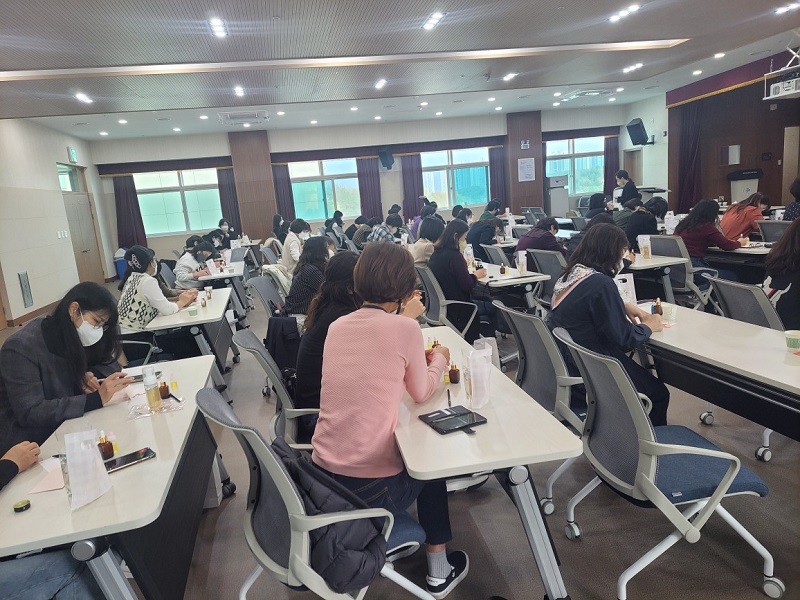 □ 연수 과정은 가을의 향기와 잘 어우러지는 밴드 공연을 시작으로 대구교대 권택환 교수님의 행복한 삶을 위한 기적의 맨발걷기로 건강힐링 특강을 실시하였다. 또한 건강힐링과 더불어 마음의 힐링을 찾기 위해 상담센터 김경미 원장의 마음 행복 찾기 특강 및 마음촉촉 에센스 아로마 테라피 키트와, 마음건강 폼클렌징 아로마 테라피 키트 만들기를 실시하였다.