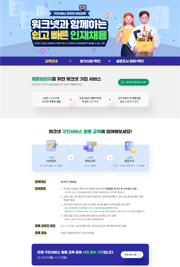 교육 대상은 워크넷 기업회원으로 교육은 11월 16일에 오전, 오후로 나눠 진행된다.