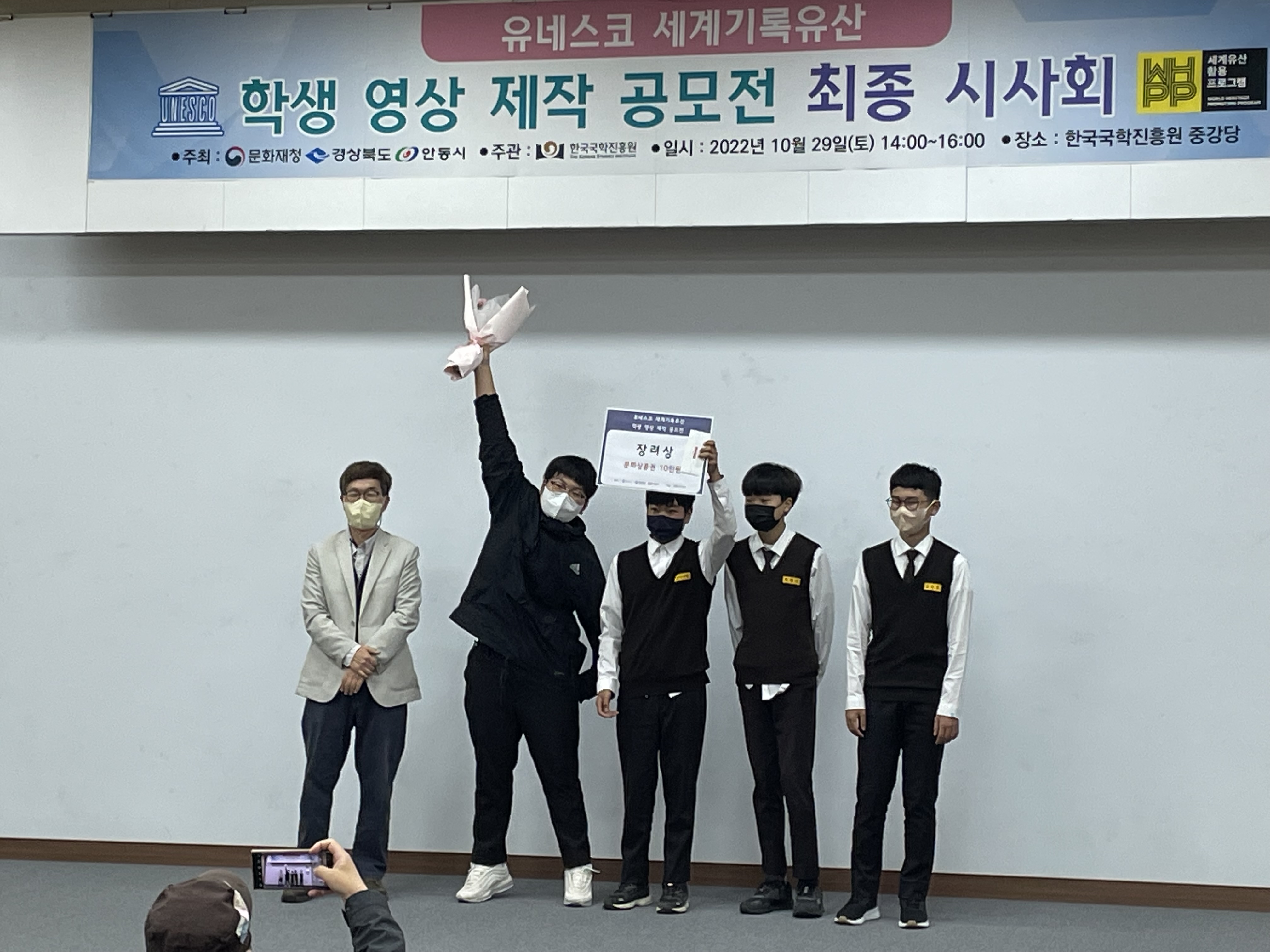 □ 영동중학교(교장 김영순)는 10월 29일(土)에 한국국학진흥원에서 주관한 “2022 UNESCO 세계기록유산 학생 영상 제작 공모전” 최종 시사회 및 시상식에서 ‘경북의 세계기록유산’이라는 주제 영상을 제작해 안동MBC 사장상과 장려상을 수상하는 쾌거를 올렸다.
