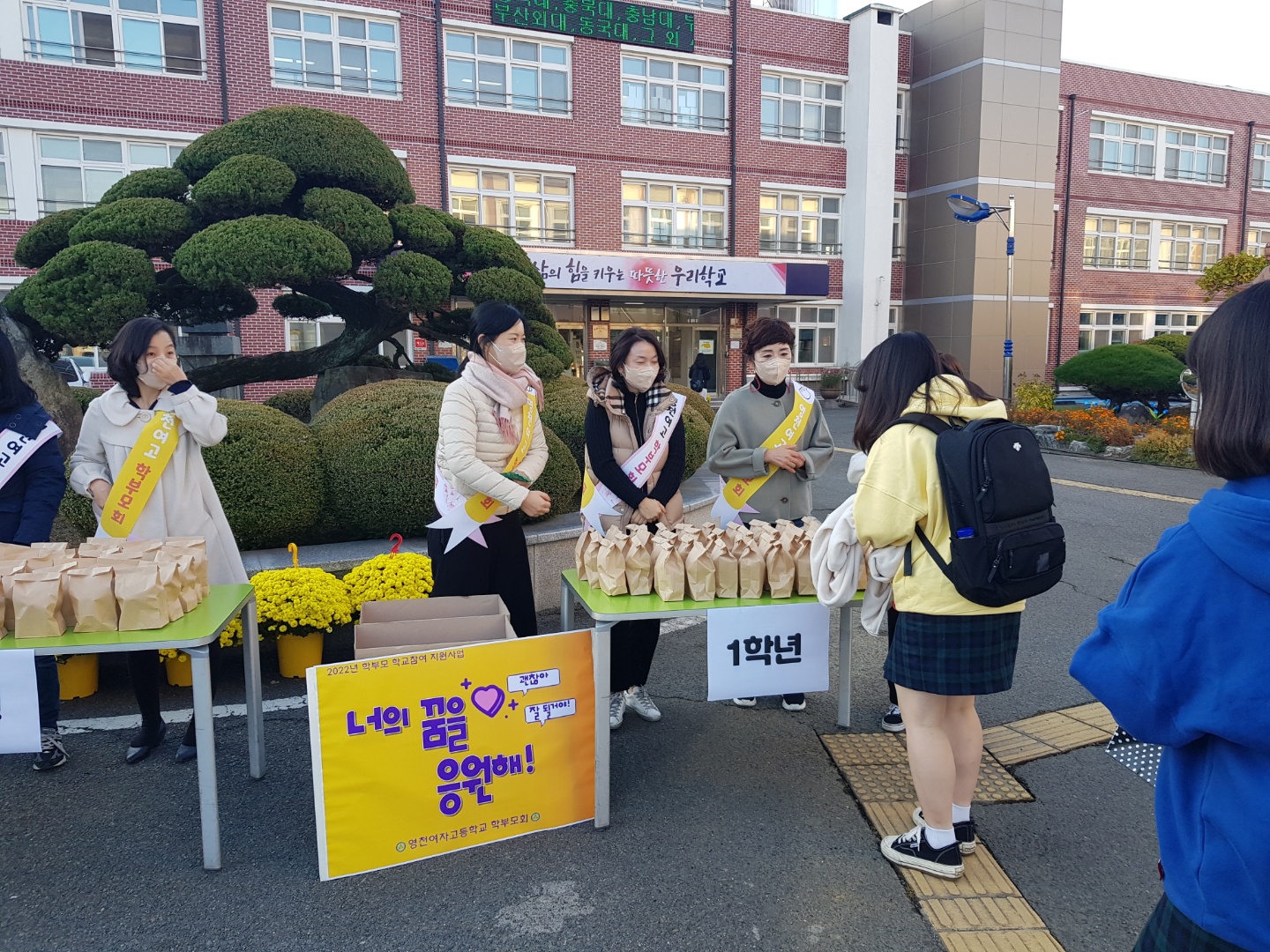 □ 가을의 끝자락을 향해가는 10월의 마지막 날 아침에 간식을 나눠주고 깜짝 이벤트를 진행하는 학부모들의 따사로운 마음과 깜짝 이벤트에 환한 웃음을 머금은 학생들, 그리고 학부모와 소통하고 학생들을 맞이하는 교사들까지 어우러져 한 주의 시작인 월요일 등굣길 영천여고의 교문 앞은 다양한 감성과 활력이 넘치는 장소가 되었다.