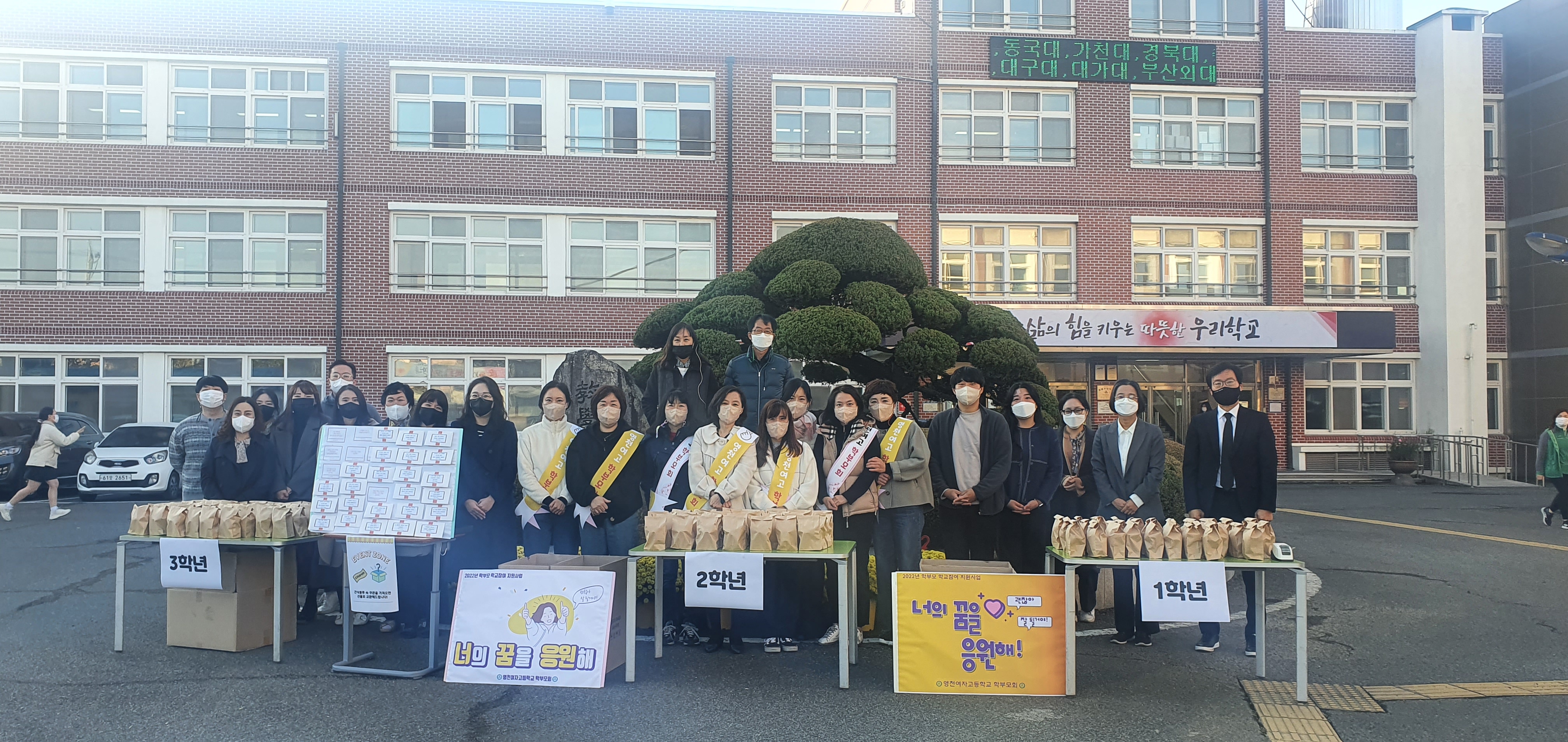 □ 영천여자고등학교(교장 신덕섭)는 2022. 10. 31.(월) 아침 “괜찮아, 잘 될거야! 너의 꿈을 응원해”라는 캐치프레이즈를 내세운 [학부모학교참여지원사업 캠페인]을 실시하였다. 이 행사는 학업과 시험, 진로고민 등으로 지친 학생들의 노력과 고민, 실천을 응원하며 위로해 주기 위해 영천여고 학부모회의 정성이 가득 담긴 간식을 학생들에게 일일이 전달하는 행사를 하게 되었다.