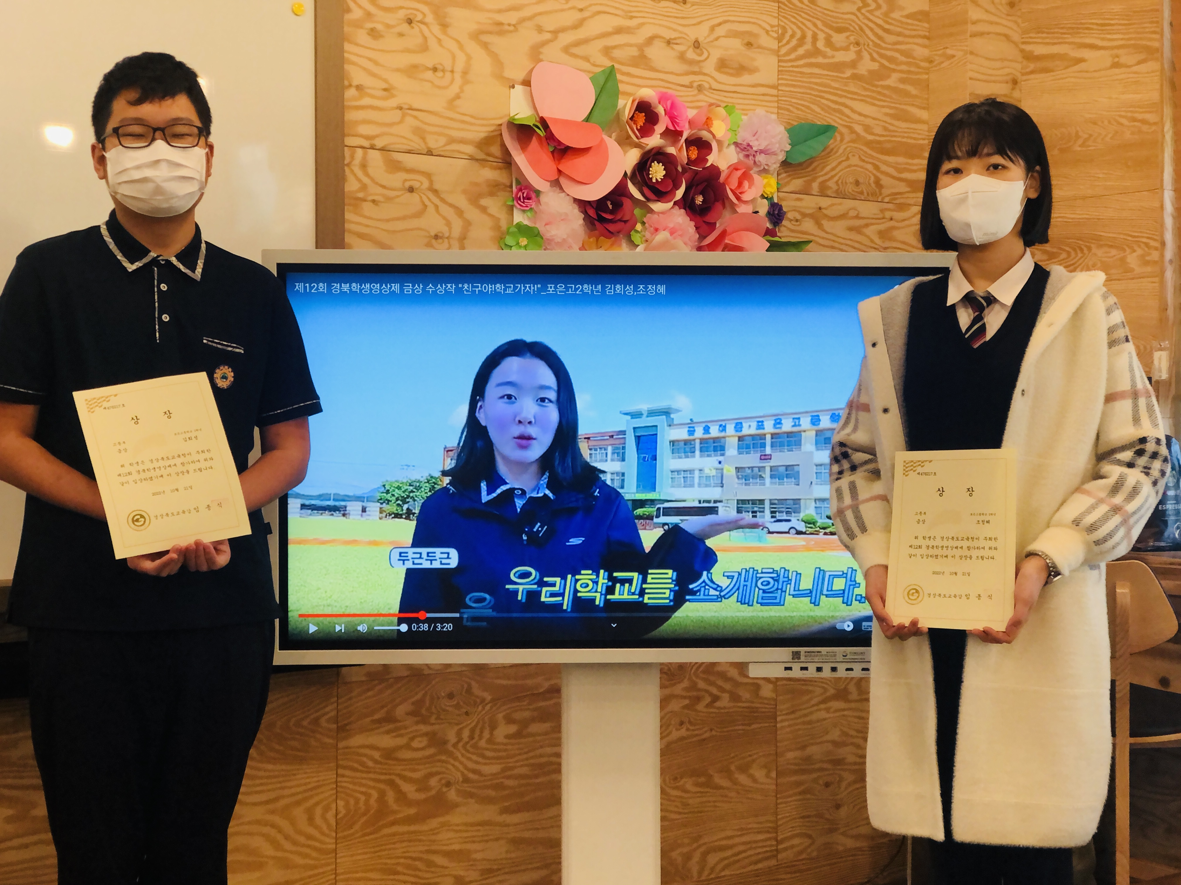 경상북도교육청 주관 ‘제12회 경북학생영상제’에서 포은고등학교(교장 박영남) 2학년 김회성, 조정혜 학생이 출품한 ‘친구야 학교가자’가 금상, 김병찬 교사가 지도교사상을 받았다.