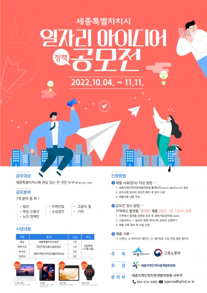 [금요저널] 세종특별자치시가 전 국민이 제안한 아이디어로 지역 특성과 여건에 맞는 일자리 정책을 발굴하기 위해 오는 11일까지 ‘일자리 아이디어 정책 공모전’을 개최한다.
