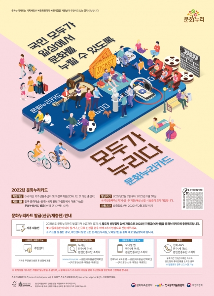 ‘문화누리카드’는 소외계층의 삶의 질 향상과 문화 격차 완화를 위해 문화 혜택을 지원하는 바우처 사업으로 문화예술뿐 아니라 국내 여행, 체육 활동 등에 사용할 수 있다.