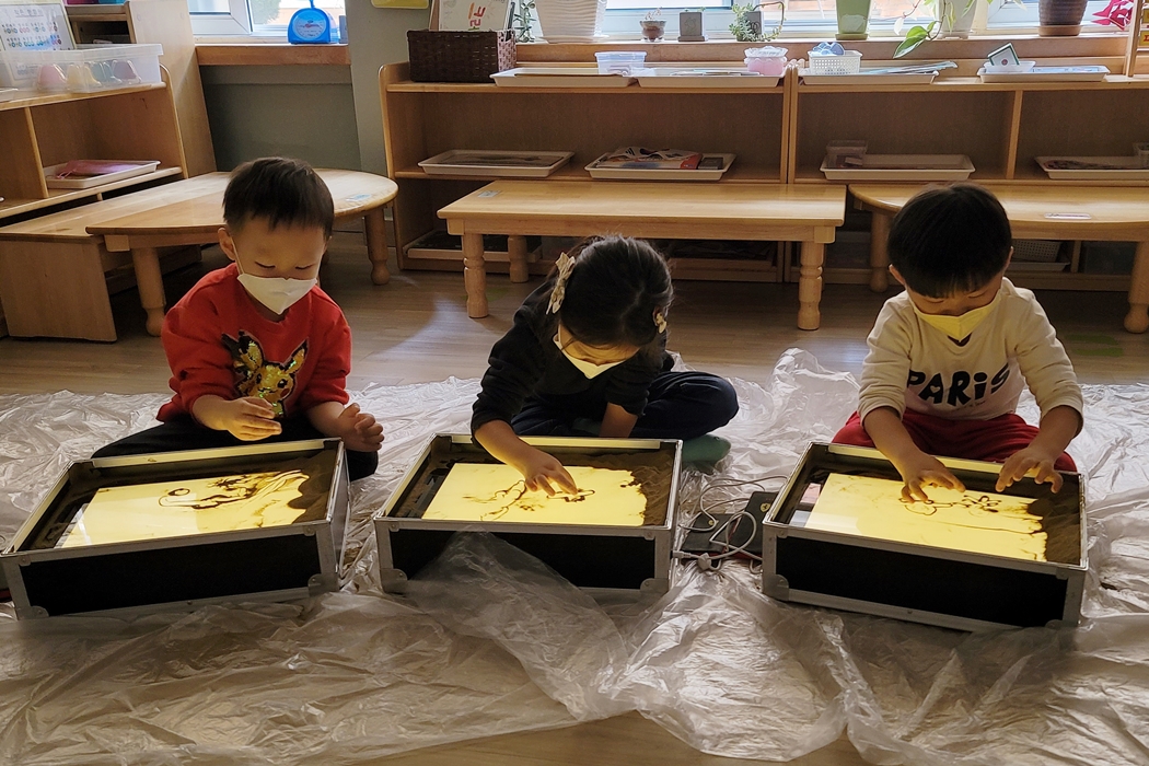 □ 공연 후 직접 샌드아트 체험을 하는 시간이 되어 먼저 모래를 만져보고 손가락 사이로 빠져나가는 모래의 감촉을 느껴보는 등 다양한 탐색 활동을 하였다. 라이트테이블 위에서 모래로 그림을 그려보는 시간에는 처음에는 주저하였으나 점차 편안한 표정으로 자신의 생각을 모래그림으로 표현하며“너무 부드러워요, 모래가 변신해요, 반짝반짝 마법 가루 같아요.”라며 신기해하였다.