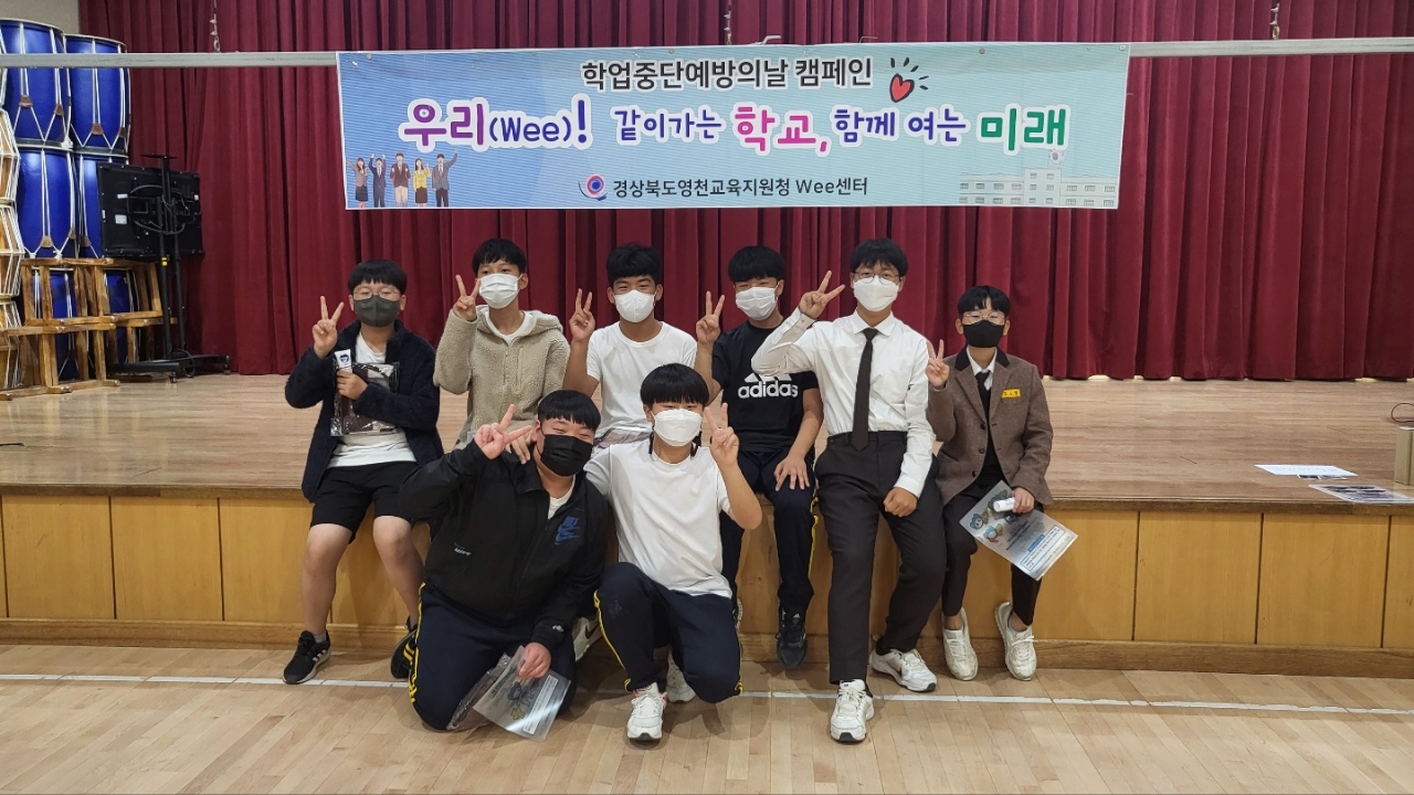 ● 영천교육지원청(교육장 양재영) Wee센터는 11월 2일(수) 영동중학교 학생들을 대상으로 학업중단예방 캠페인을 실시했다. 학업중단예방 캠페인은 학업중단숙려제를 안내하며 학업중단예방을 위한 활동들로 진행된다.