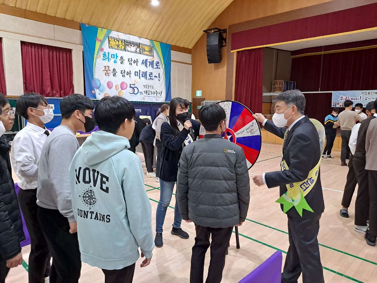 ● 이번 캠페인은 영동중학교 강당에서 점심시간인 12시 30분부터 진행되었고, 원판돌리기의 결과에 따라 학업중단위기 학생에게 전하는 응원 포스트잇 부착, 희망 메시지 추첨, 우정 사진 찍기 활동 중 하나를 수행하고 추첨상품을 증정받았다.