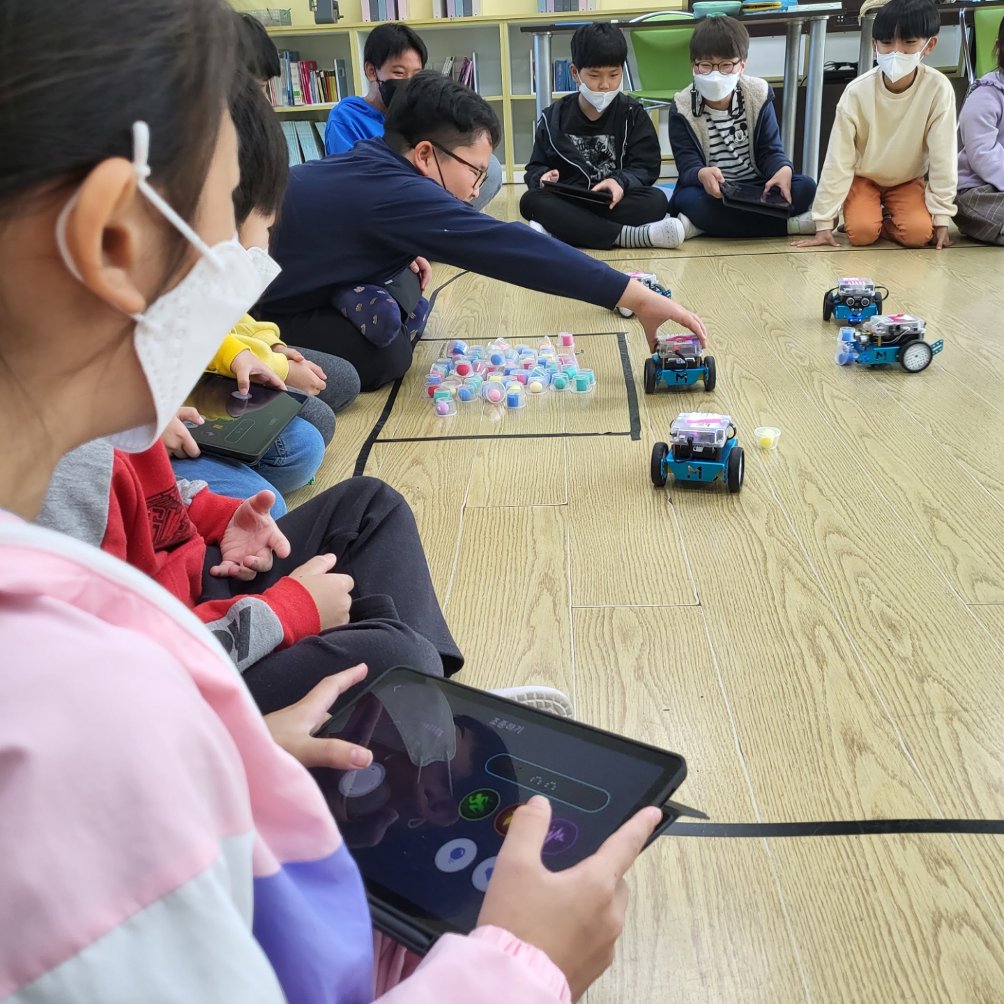 □ 먼저 인공지능 코딩로봇 체험에서는 인공 지능에 대한 이해를 바탕으로 스마트 코딩봇의 자율주행을 체험하고 코팅봇을 활용한 축구게임을 실시하였다. 태블릿 PC를 콘트롤러로 이용하여 코딩봇이 장애물을 감지하고 보물을 찾는 등 코딩 기술을 응용한 미션도 수행하였다.
