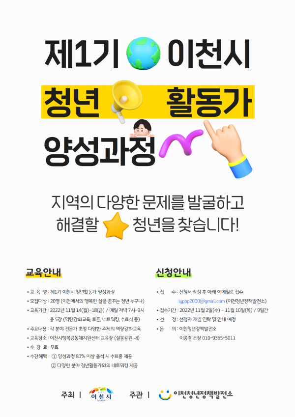 청년활동가 양성 교육은 각 분야의 전문가를 초청해 다채로운 커리큘럼을 진행해 지역문제에 관심있는 청년들을‘청년활동가’로 양성하고 청년들이 직접 지역 문제를 발굴·해결하며 다양한 분야에 역량을 갖춘 청년 리더로 양성하고자 이천시의 지원을 받아 오는 11월 14일부터 18일까지 5일간 이천시행복공동체지원센터에서 진행한다.