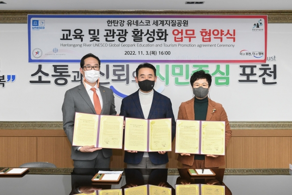 이번 업무협약은 포천 한탄강 유네스코 세계지질공원 재인증과 지속가능한 발전을 위해 지리적 이점을 살린 체험교육과 체류형 관광 육성 사업을 추진하기 위해서 마련됐다.