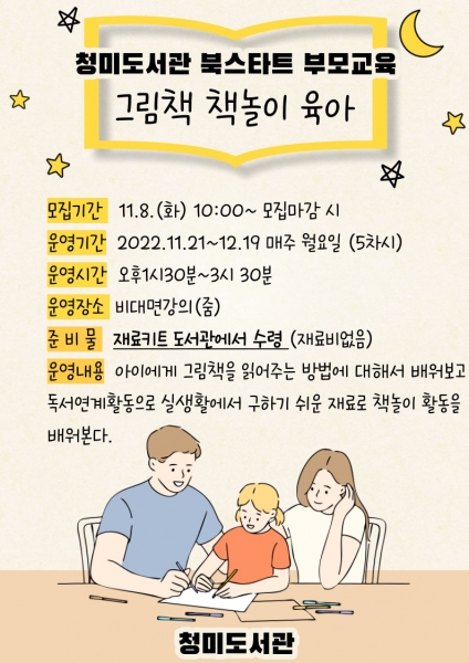 [금요저널] 청미도서관은 오는 11월 21일부터 북스타트 부모교육 그림책 책놀이 육아 프로그램을 운영한다.
