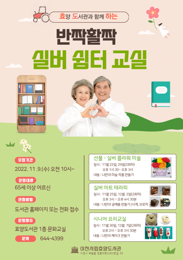 효양도서관에서는 오는 11월 22일부터 실버 플라워 미술 프로그램 실버아트 테라피 시니어 요리교실등 다양한 노인 건강 증진 프로그램을 운영하며 2022년 11월 9일부터 도서관 홈페이지 또는 전화로 신청 가능하다.