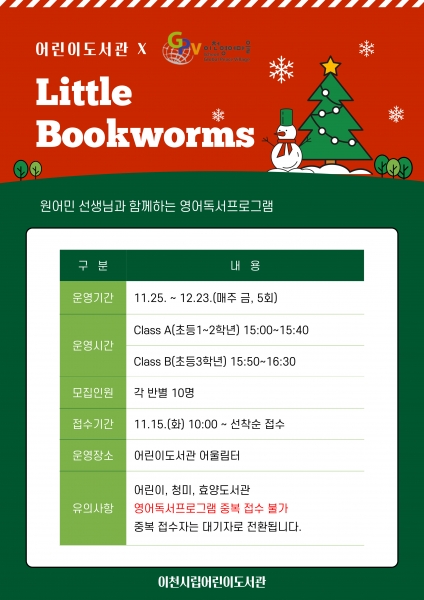 이천영어마을과 어린이도서관이 함께 하는 ‘Little Bookworms’ 2기는 11월25일부터 12월23일까지 매주 금요일 5주 동안 원어민 선생님과 함께 영어책을 읽고 책과 관련된 다양한 체험활동으로 영어책과 친해질 수 있는 기회를 제공한다.