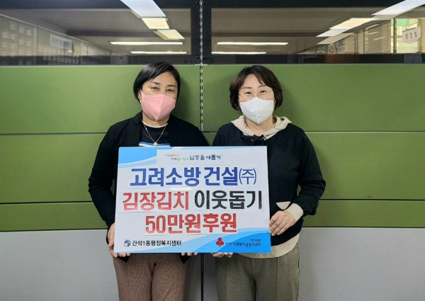 김혜영 동장은 “후원금을 지원해주신 고려소방건설에 감사드리며 사랑과 정성이 담긴 김치를 어려운 이웃에 잘 전달하겠다”며 “저소득 소외계층이 따뜻한 겨울을 보낼 수 있도록 최선을 다하겠다”고 전했다.