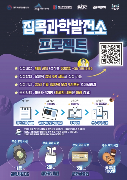 세종 집콕과학발전소는 11월 3일부터 선착순 500개 소진시까지 신청자의 주소지로 랜덤 배송될 예정이며 세종시민이라면 누구나 체험하고 우수 후기를 작성하면 추가 선물도 증정될 예정이다.
