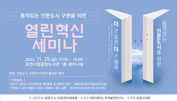 [금요저널] 포천시는 오는 25일 포천시립중앙도서관 세미나실에서 민선8기 4대 시정방향 중 하나인 ‘품격있는 인문도시’ 구현을 위한 열린혁신 세미나를 개최한다.