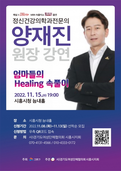[금요저널] 경기도여성단체협의회 시흥시지회가 오는 15일 저녁 7시 시흥시청 늠내홀에서 정신의학과 전문의 양재진 원장을 초빙해 ‘엄마들 힐링을 위한 속풀이: 건강한 여성의 삶을 위한 정신건강관리’라는 주제로 엄마들을 위한 강연을 선보인다.