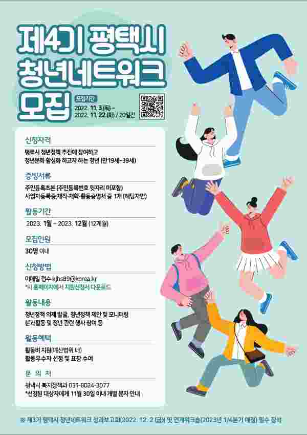 [금요저널] 평택시는 청년의 다양한 의견 수렴과 청년정책 추진을 위해 구성·운영하는 ‘제4기 평택시 청년네트워크’를 모집한다고 밝혔다.