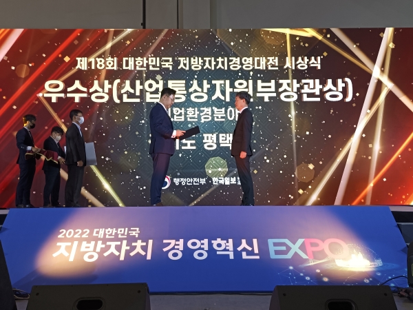 [금요저널] 평택시는 지난 10일 각 지자체의 우수 정책을 대상으로 부산벡스코에서 개최된 ‘제18회 대한민국 지방자치경영대전’ 시상식에서 우수상인 산업통상자원부 장관상을 수상했다.