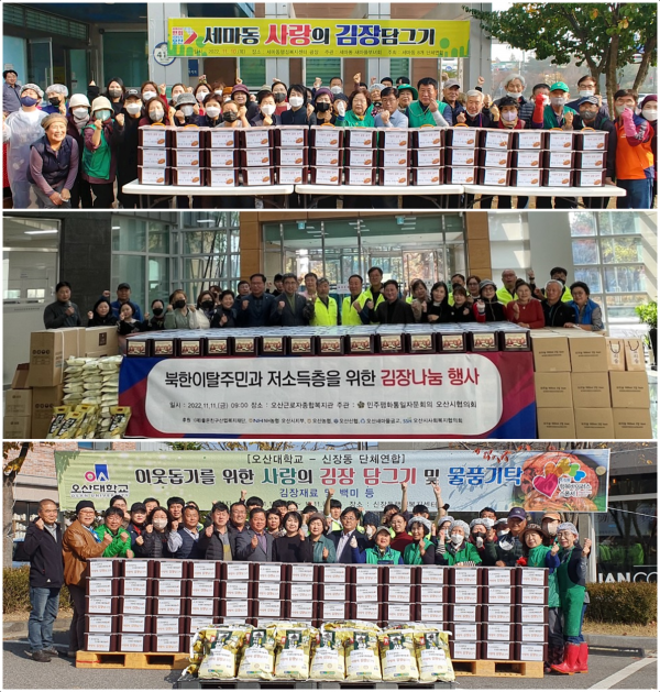 또 같은 날 신장동행정복지센터에서 8개 단체연합 회원과 오산대 관계자 등 100여명이 참여한 가운데 김장김치 500포기를 완성했다.