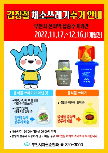 [금요저널] 부천시는 11월 17일부터 12월 16일까지 김장철 채소 쓰레기 집중 수거 기간을 운영하고 올바른 배출 방법을 함께 홍보한다.
