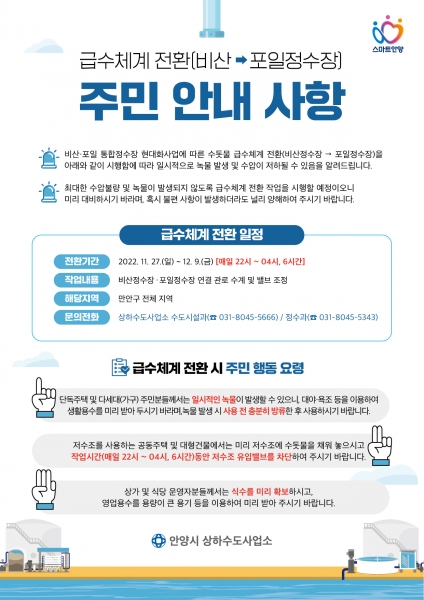 이에 따라 비산통합정수장 신설공사 기간 중 비산정수장 대신 포일정수장으로 만안구 급수체계를 전환하는 과정에서 물의 방향이 평소 흘려보내던 방향과 반대 방향으로 흐르는 경우가 생겨 불가피하게 녹물이 발생할 수 있다.
