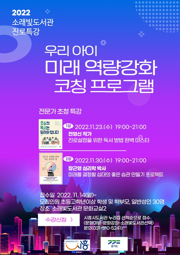 [금요저널] 시흥시 소래빛도서관은 아이와 학부모를 위한 진로특강으로 ‘우리 아이를 위한 미래 역량강화 코칭 프로그램’을 오는 23일과 29일 두 차례에 걸쳐 운영한다.