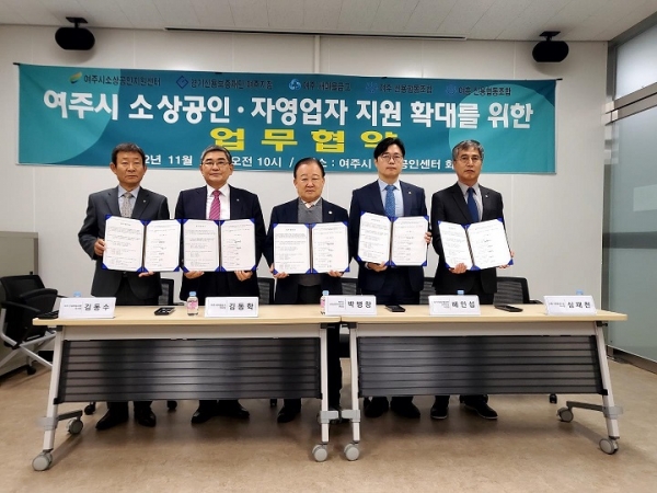 [금요저널] 11월 15일 여주시소상공인지원센터는 센터를 주체로 경기신용보증재단 여주지점과 여주새마을금고 여주신용협동조합, 여흥신용협동조합이 상호 신뢰를 기초로 해 여주시 소상공인의 경영안정과 지역경제 활성화를 위한 업무협약을 체결했다고 밝혔다.