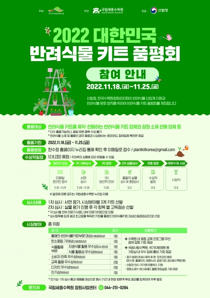 [금요저널] 한국수목원정원관리원은 18일부터 25일까지 22년 대한민국 반려식물 키트 산업전 품평회 참여자를 모집한다.