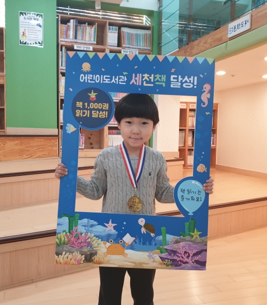 박서현 어린이는 11월 19일 어린이도서관에 방문해 세천책 달성 인증서와 메달을 받았다.