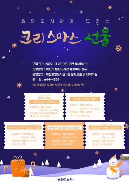 [금요저널] 이천효양도서관은 크리스마스와 연말을 맞아 이천시민이 특별하고 기억에 남는 크리스마스를 맞이할 수 있도록 ‘효양도서관 크리스마스 선물 강좌’를 운영한다 이번 ‘크리스마스 선물 강좌’ 프로그램은 12월 7일 엄마랑 아빠랑 크리스마스 케이크 만들기를 시작으로 12월 14일 나만의 크리스마스 케이크 만들기 12월 10일 반짝 반짝 크리스마스 트리 만들기 12월 10일 크리스마스 눈사람 트리 만들기 등의 다양한 활동이 준비돼 있다.