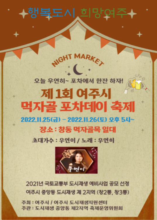 [금요저널] 여주시는 ‘중앙동 2지역 도시재생 예비사업’의 일환인 ‘제1회 먹자골 포차데이 축제’를 오는 11월 25일부터 26일까지 이틀간 창동 테마거리에서 개최한다고 밝혔다.