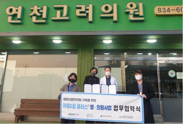 [금요저널] 연천군정신건강복지센터 부설 연천군자살예방센터는 연천 고려의원, 전곡 온의원과 업무 협약을 맺고 정신건강문제 조기발견과 생명사랑 안전망을 구축하는 ‘마음G킴 플러스 병·의원사업’을 실시한다고 29일 밝혔다.